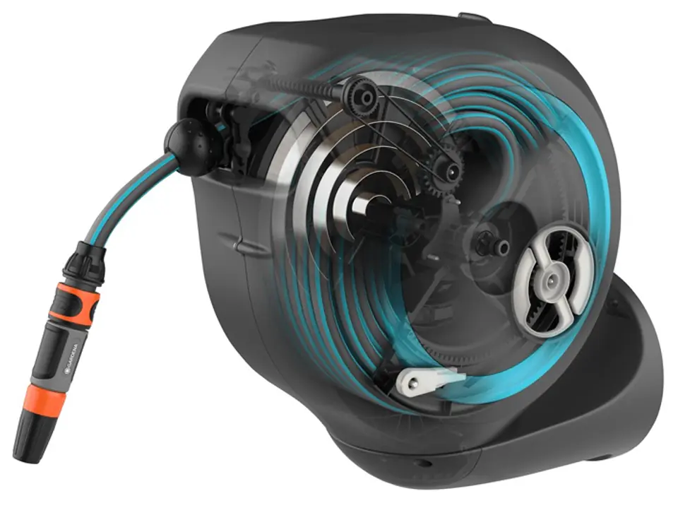 A light pull on the end of the hose releases the lock, and the built-in steel spring with innovative RollControl technology ensures smooth, controlled retraction.
