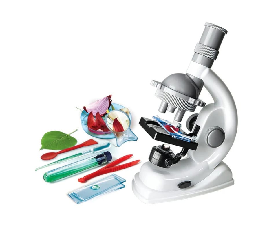 A real, professional and easy-to-use microscope for examining the microcosm at 600x magnification. Numerous experiments and fantastic scientific observations. Rich equipment for observing the world around us: plastic glasses, cups, pipettes, magnifying glass and special enlarged photos.
