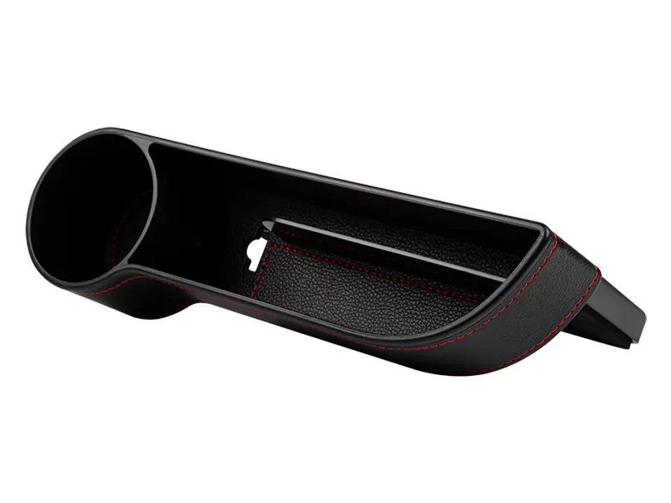 Car slotted storage compartment with compartments and cup holder designed for installation on the left side between the front passenger seat and the gearbox. The exceptionally nice upholstery in black is the certainty of fitting the product into any car interior, and the red thread emphasizes the unique and modern design. In the front part there is a holder for drinks (cup, glass, can or bottle).