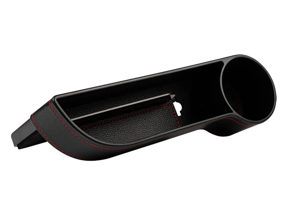 Car slotted storage with compartments and cup holder designed for installation on the right side of the driver between the seat and the gearbox. The exceptionally nice upholstery in black is the certainty of fitting the product into any car interior, and the red thread emphasizes the unique and modern design. In the front part there is a holder for drinks (cup, glass, can or bottle).