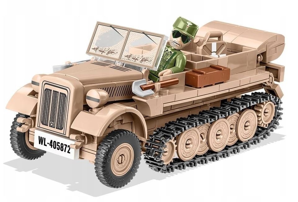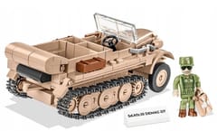 The Sd.Kfz.10 artillery tractor has been designed with attention to detail in model scale 1:35 using 290 components. It includes moving parts and high-quality, durable prints. The set is a perfect addition to the growing collection of 1:35 scale model vintage vehicles being released, and is sure to find a place in your collection alongside the Blitz trucks, Horch cars and other amazing vehicles released in the same series and scale by COBI. The set includes a figurine of an Afrika Korps soldier. There are additional accessories on the vehicle such as a new type of box and a spade and crowbar.