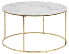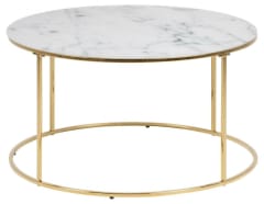 The presented product was created with the utmost care, drawing attention to every detail. The legs of the table are made of metal in gold chrome. The chic of the whole is added by a glass top with a marble print in a shade of white. To ensure comfort of use, the coffee table is equipped with a footrest.