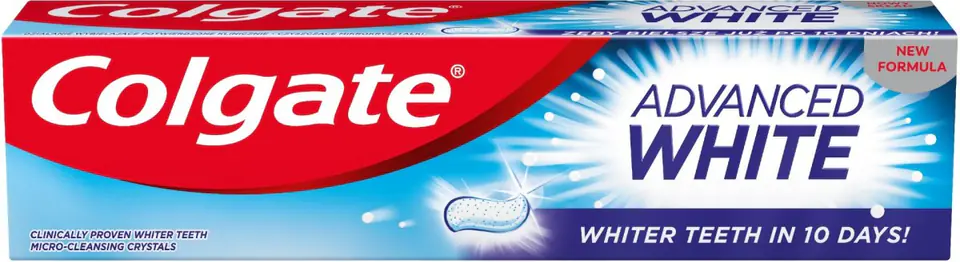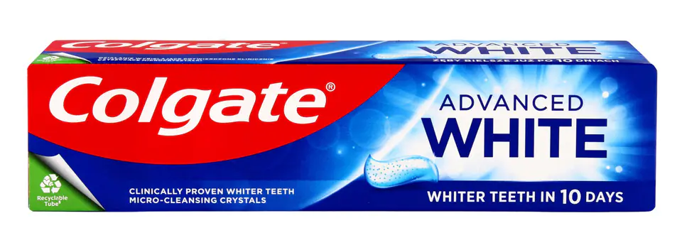 Colgate Advanced White paste with active cleaning microcrystals gently polishes and effectively whitens teeth, and its action has been clinically confirmed. It also helps prevent the formation of new discolorations, thanks to which the teeth remain white longer.