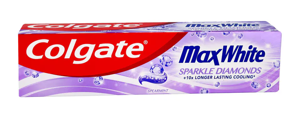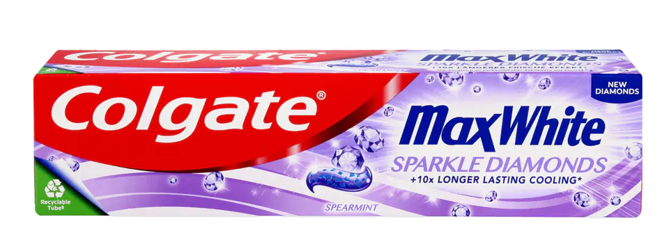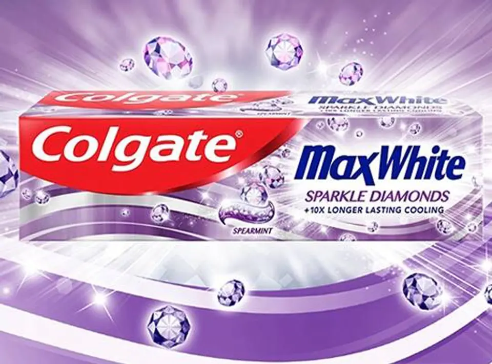 10X LONGER FRESHNESS* + WHITER AND SHINIER TEETH Colgate MaxWhite Sparkle Diamond is a toothpaste that makes teeth whiter and shinier. Toothpaste is saturated with hundreds of micro-crystals that strengthen and polish the enamel. Crystals dissolve during brushing, the paste formula releases an explosion of whitening force that restores the natural whiteness of the teeth and makes the teeth smoother and shiny. *FreshFX technology delivers freshness that lasts 10 times longer than regular fluoride toothpaste Colgate Max White Sparkle Diamond toothpaste : - Restores natural whiteness - Strengthens and polishes enamel - Helps fight tooth decay - Makes teeth shinier