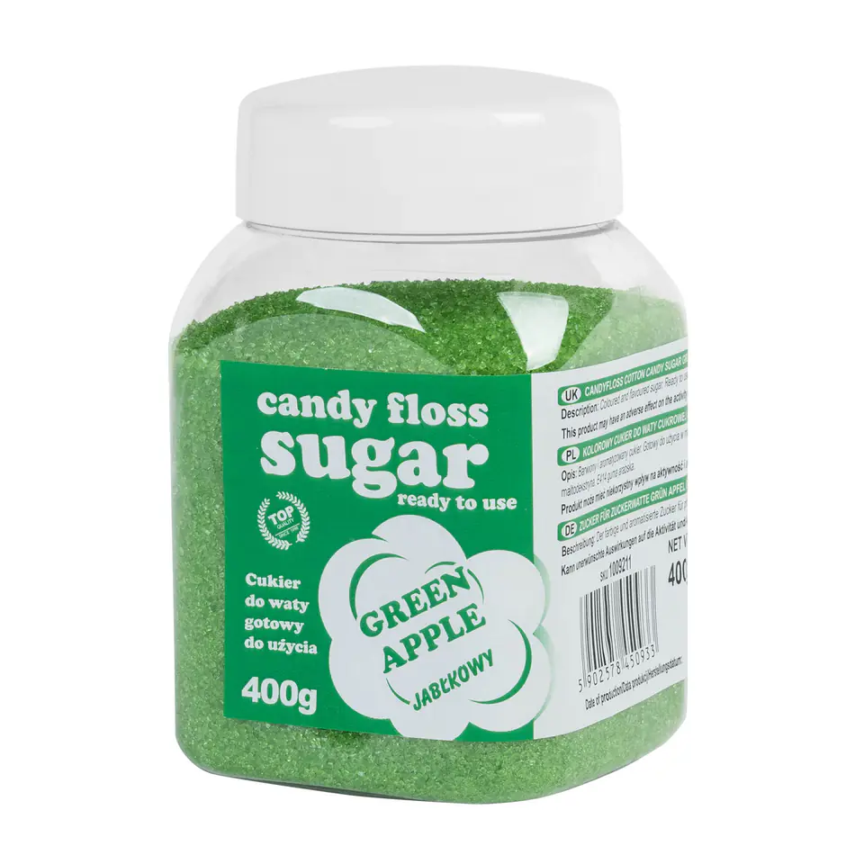 Colored sugar for cotton candy green with apple flavor. Coloured and flavoured sugar. Ready for use in machines for making cotton wool from sugar. The highest quality - 20 YEARS OF EXPERIENCE in the production of cotton candy and colored sugar to cotton wool.