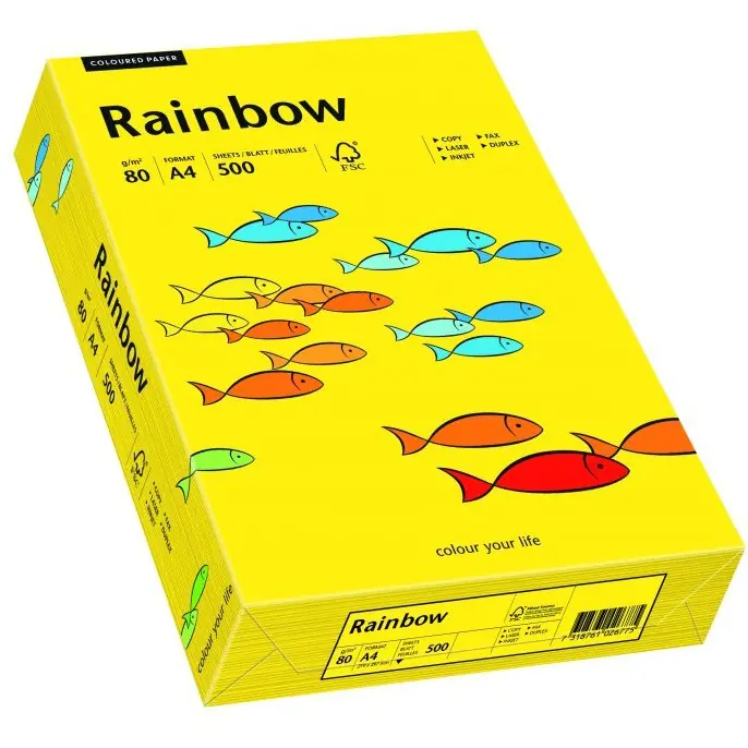 Colored paper Rainbow dark yellow 18_Wysokiej quality, colored paper, wood-free, dyed in mass, with a wide range of colors. Recommended for fax printouts, correspondence and invitations and leaflets. Packed in elegant transparent packaging. A4 80 g colour intensywny_- Sales unit 1 ream