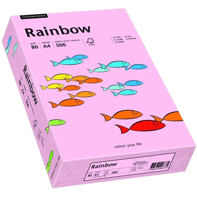 Rainbow light pink colored paper 54High quality, coloured paper, wood-free, dyed in mass, with a wide range of colours. Recommended for fax printouts, correspondence and invitations and leaflets. Packed in elegant transparent packaging. A4 80 g colour pastelowy_- sales unit 1 ream