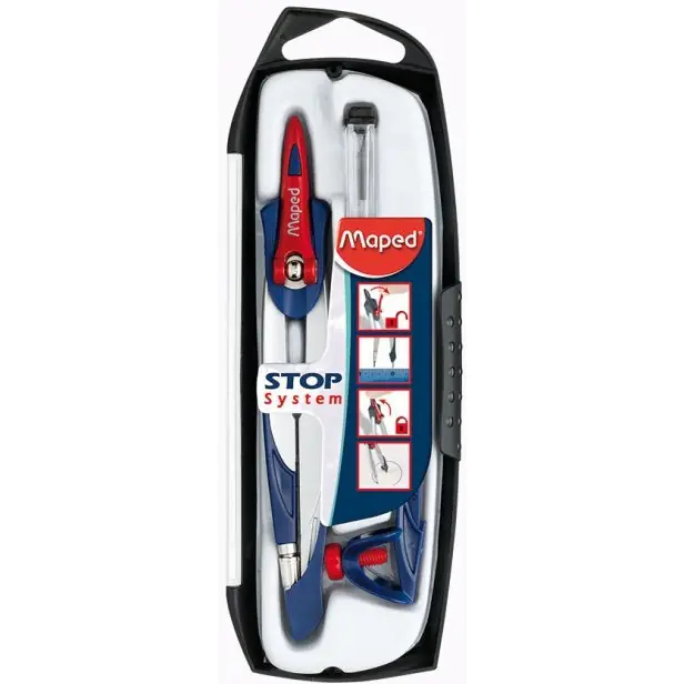 Metal compass STOP SYSTEM with graphite tip in a plastic case set with 2 elements: universal pencil holder and spare graphite. Patented arm lock system in a specific position. A special needle cap protects against cuts. JS 1 pc.