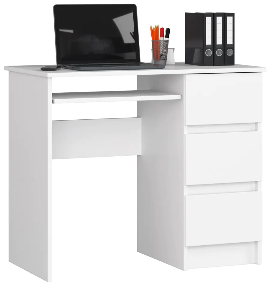 A white computer desk is an ideal proposition for all those who appreciate classic forms in a modern edition. The furniture is made of abrasion-resistant laminated board, and its edges are reinforced with ABS edging. The 90cm computer desk is perfect for minimalist interiors, but also for those slightly more extravagant. Its white color gives any room lightness. Our piece of furniture is often chosen by individual customers who place it in the living room, bedroom, studio or study. A computer desk with a pull-out shelf is also increasingly appreciated by entrepreneurs and business owners. Our product is used in office spaces. A laptop can be easily placed on a roomy worktop, and spacious drawers will accommodate the most important documentation. The desk we offer combines two very important features. It was made of materials of excellent quality and has high aesthetic values.