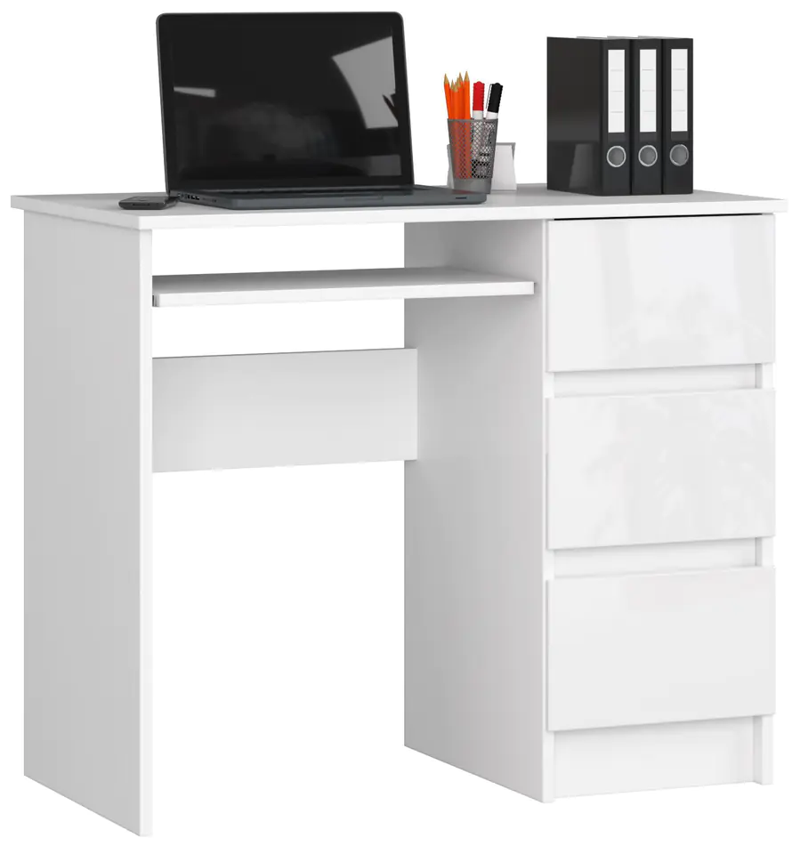 The desk consists of a 90-centimeter long worktop, three drawers and a pull-out shelf for the keyboard.