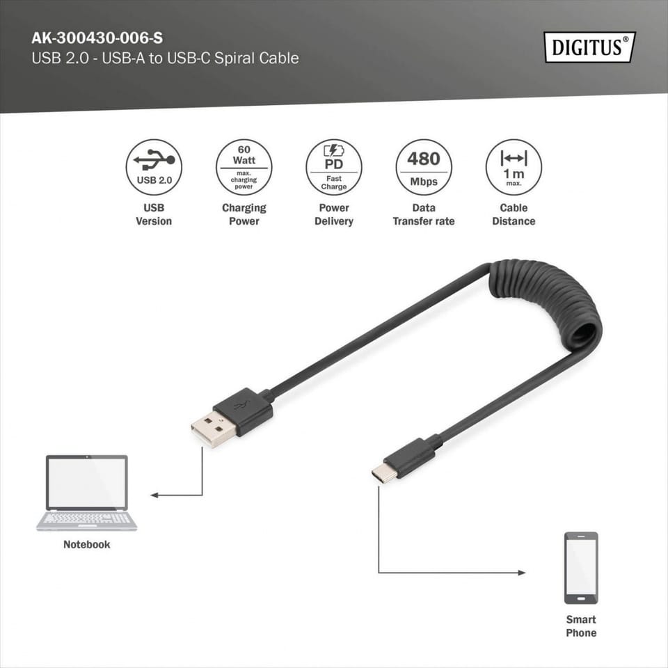 Flexible and highly durable spiral cable for charging and data synchronisation. With the DIGITUS cable you can charge devices such as smartphones, tablets etc. You can also synchronise data with your PC or laptop. Ideal for the car.
