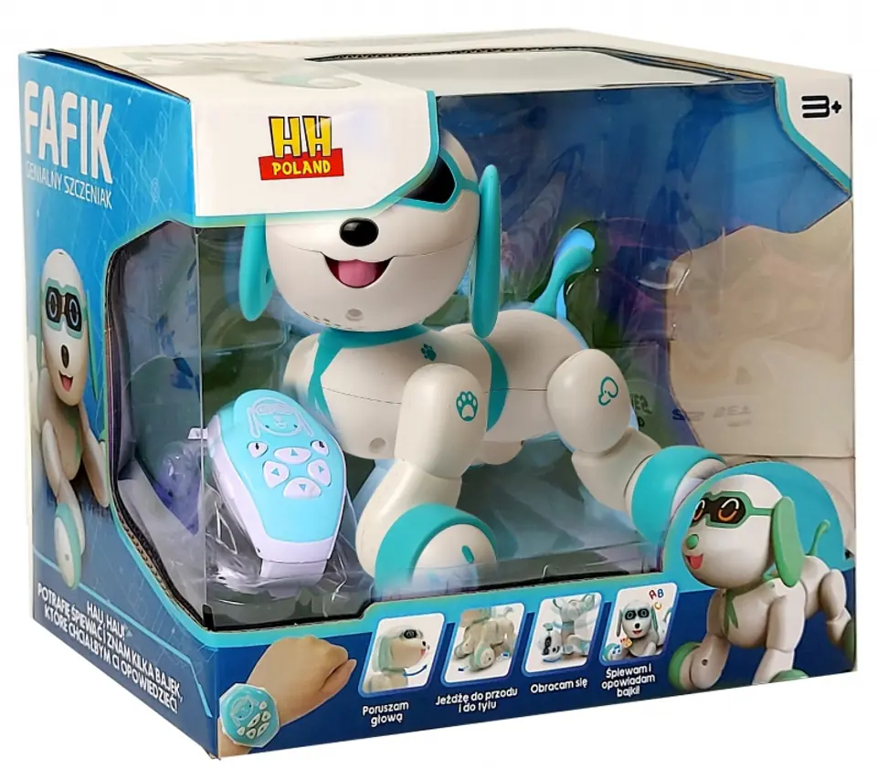 Fafik speaks, barks, sings songs, tells fairy tales, dances,