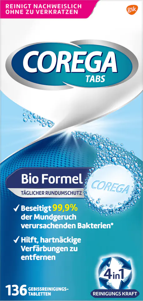 1. Place the Corega TAB in a glass with enough warm (not hot) water so that the (partial) dentures or removable bridge are completely covered with liquid.