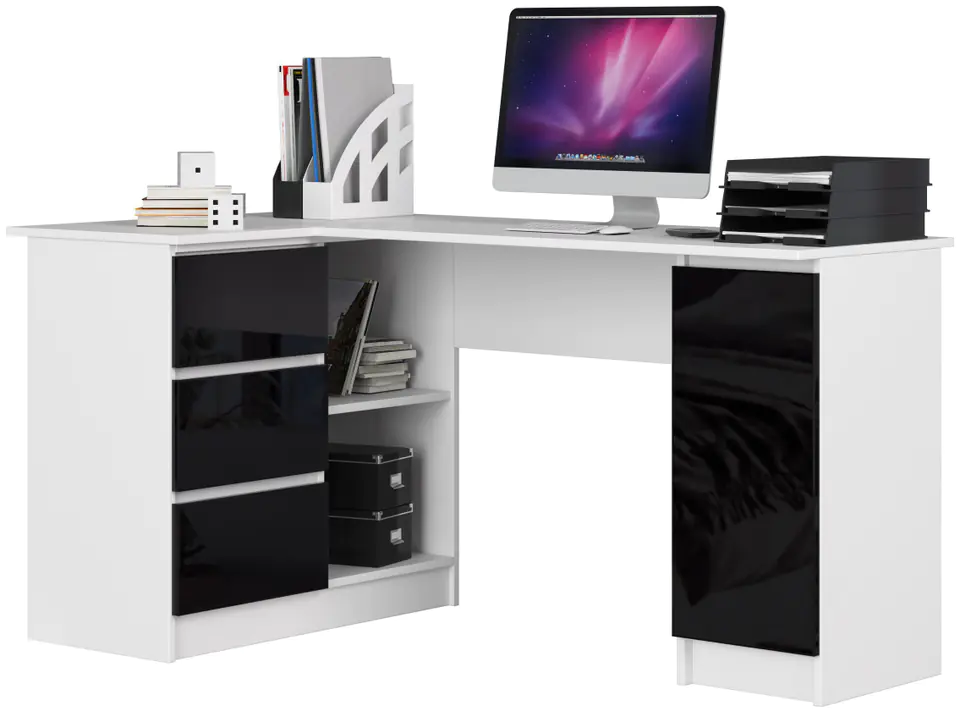 The offered corner desk has a body in white, matte color and capacious drawers, whose acrylic fronts are in black gloss. Made of 16 mm laminated board, which is resistant to abrasion, which significantly extends the preservation of the great appearance of the furniture. In addition, the edges have been covered with ABS edging, its use allows protection against mechanical damage. The desk is 155 cm long, 77 cm high and 85 cm deep. It contains as many as 3 drawers, a shelf for books, and even binders and a side cabinet where you can hide many useful things. The fronts are modern, handleless. Corner desk is perfect for a teenager's room, a younger child's room or even an office. The simple and minimalist look makes it fit into any interior, and thanks to the use of neutral colors, the desk can be successfully composed with other furniture.