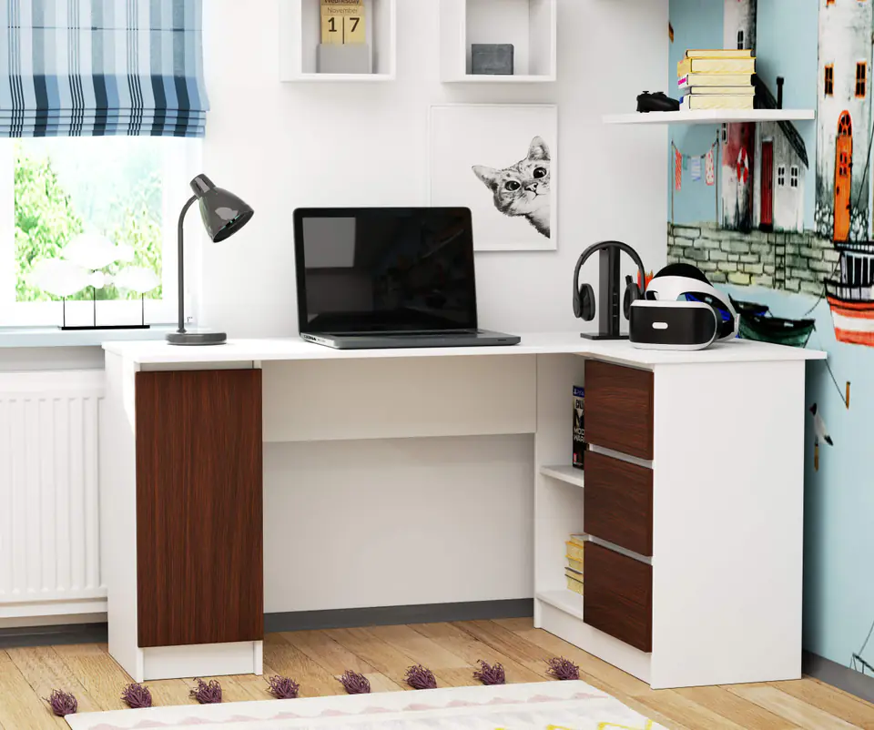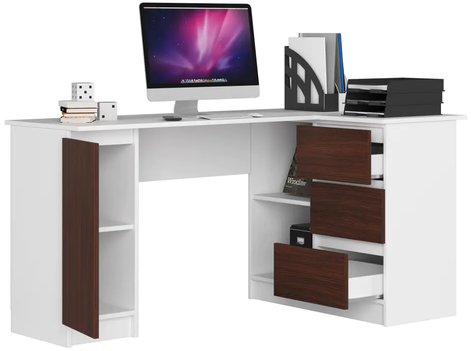 Corner desk B20 155cm Right White /Wenge is made of abrasion-resistant laminated board from Kronospan with a thickness of 16 mm. White body, door and drawer fronts in Wenge wood pattern in matte, practical finish. Equipped with one door, three drawers and an open shelf.