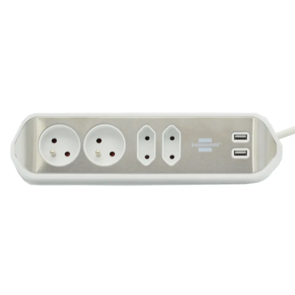 The compact Brennenstuhl Estilo corner power strip made of highly break-resistant plastic and high-quality stainless steel surface brings order to your home. The universal base strip can be easily attached as a kitchen base strip to the worktop or as a socket strip to the workplace table with the help of special adhesive pads. The strip for kitchen or table sockets can be mounted horizontally or vertically. It also convinces with the following features: