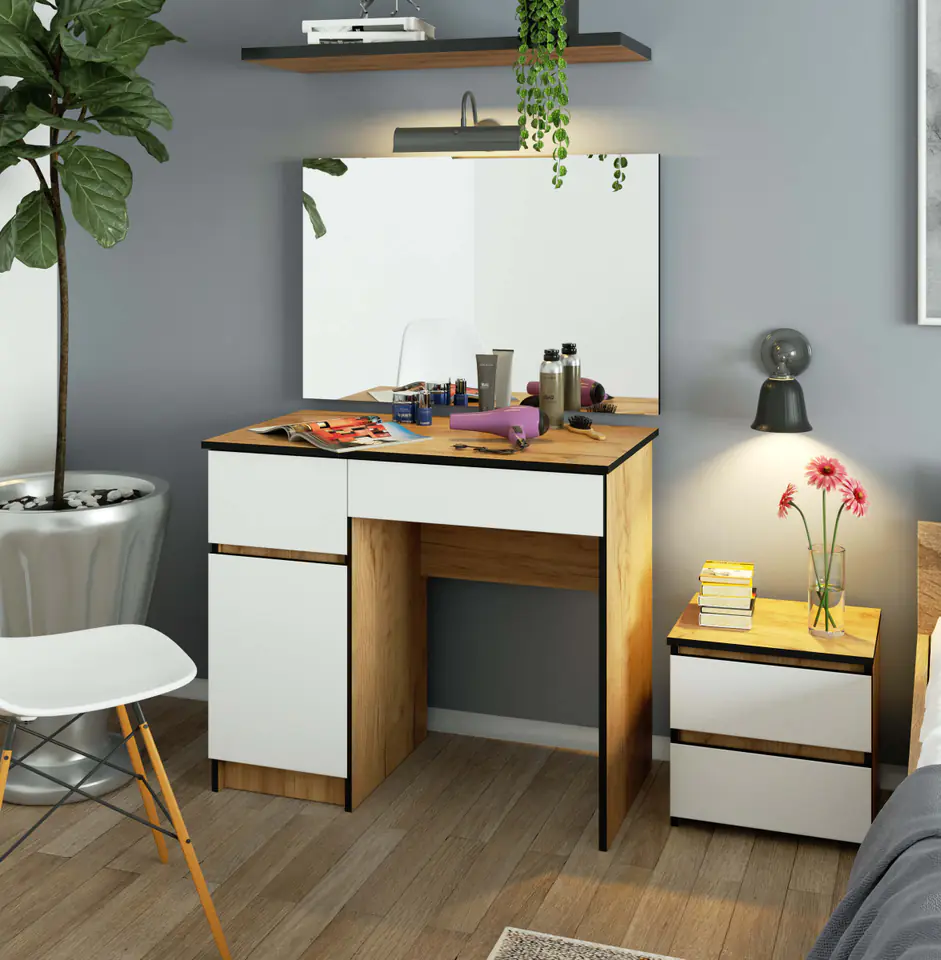 Dressing table with a mirror in oak color, craft fronts white with drawers and a roomy place behind the door.