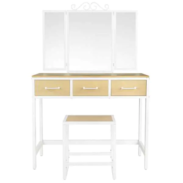 Cosmetic dressing table with mirror and drawers in industrial style white VASAGLE Beautiful white dressing table with 3 mirrors that can be opened from two sides and viewed from different angles. Thanks to this possibility, you will make the perfect makeup and hairstyle. The natural color of the worktop, white metal frame, delicate handles at the drawers will give your room a unique character. Solid frame and high-quality table top make this product will serve you for many years. Hooks are placed on the back of the mirror so that you can hang your favorite jewelry. The set includes a stool that beautifully complements everything into one whole. Adjustable feet allow you to set the dressing table on an uneven surface. Clear instructions and marked parts will quickly allow you to assemble this beautiful piece of furniture in a quick and trouble-free way. Specification: frame color: white, table top color: natural, material: particleboard, metal, glass, dressing table size: 90 x 40 x 137.5 cm (l x w x h), stool dimensions: 38 x 28 x 43 cm (l x w x h), weight: 24 kg.