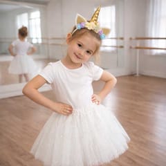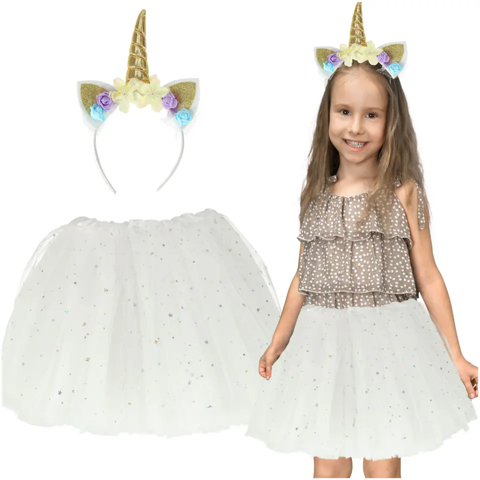 Carnival costume unicorn headband and white princess skirt covered with shiny stars.