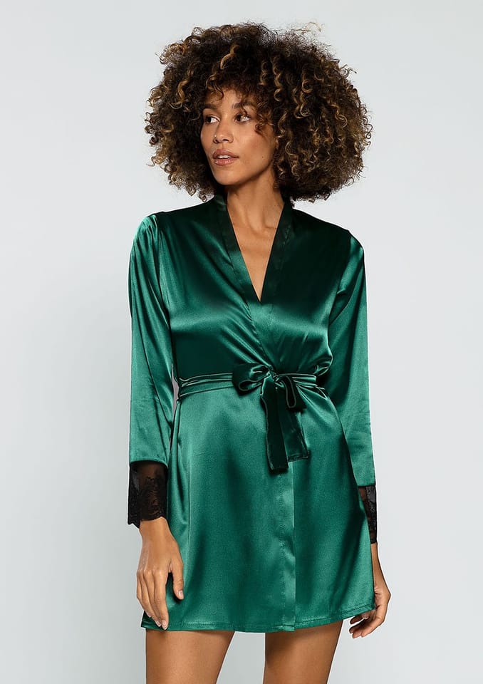Prosta i klasyczna - dla jednych zbyt nudna, dla innych z kolei seksowna i zmysłowa. Podomka Hailey wykonana jest z przyjemnego satynowego materiału. Po założeniu szlafroczka, trudno będzie się z nim później rozstać. Podomka uszyta jest według klasycznego wzoru - sięga przed kolana oraz posiada długie, luźne rękawki, które zakończone są czarną koronką. Szlafroczek przewiązywany jest cienkim paskiem, dzięki któremu każda kobieta może podkreślić swoją talię, a przy okazji podkreślić swoje kształty. Podomka Hailey dostępna jest w kolorze butelkowej zieleni. Jest to niezywkle modny odcień szlafroczka satynowego. Przed złożeniem zamówienia - pamiętaj, aby zapoznać się z rozmiarówką. W przypadku pytań odnośnie naszej bielizny, jesteśmy do Twojej dyspozycji. Z przyjemnością na nie odpowiemy. Gotowa na to, aby poczuć się komfortowo i wygodnie, a zarazem elegancko z Dkaren?