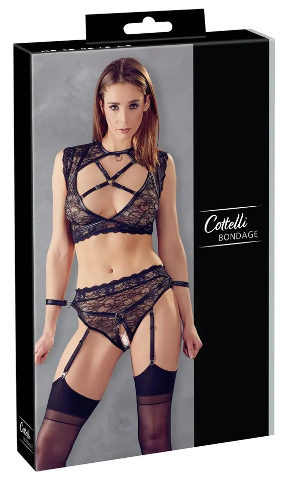 Elegant set of underwear from the Cottelli Bondage series. Bra, poncho belt and briefs included. The underwear is made of elastic mesh with matte details decorated with studs. Bra without underwires with open cups (fastened with snaps). Three adjustable straps leading to the collar fastened with a snap. The straps can be adjusted to ensure a perfect fit. The garter belt has a small circle at the front and one of the sides. The included handcuffs with carabiners can be attached to the rings on the sides. The garter belt has a hook fastener at the back and adjustable shoulder straps. Transparent briefs complete this exciting set. Material: 90% polyamide, 10% spandex.
