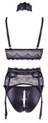 Bra with removable cups (it can be unzipped), adjustable straps in the neckline area and collar. Fitted garter belt with decorative ring at the front and adjustable garter straps. Detachable handcuffs with Velcro fasteners at the back are included . Figs with latches that pass through the perineum and stop at the top of the buttocks.