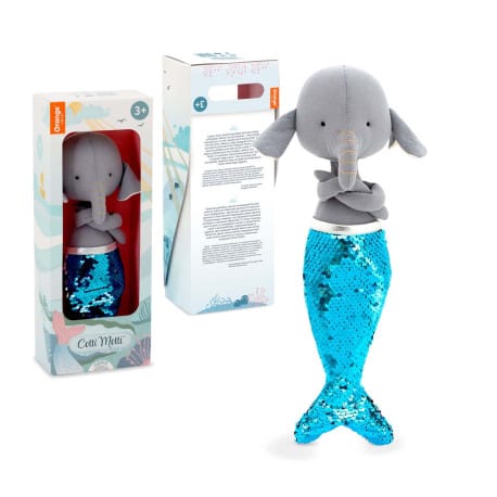 Cotti Motti Elephant Alice: Mermaid Edition Characteristics beautifully made of natural materials shiny removable mermaid tail has ordinary legs (after removing the tail) reversible sequins on the tail allow you to change color attention to every detailaesthetic box Includes mascot mermaid tail box perfect for a gift Dimensions Mascot height: 29 cm Package dimensions: 38 cm x 15 cm x 11 cm Toy designed for children from 3 years of age. CE certified. Hand wash at 30 degrees CM04-14