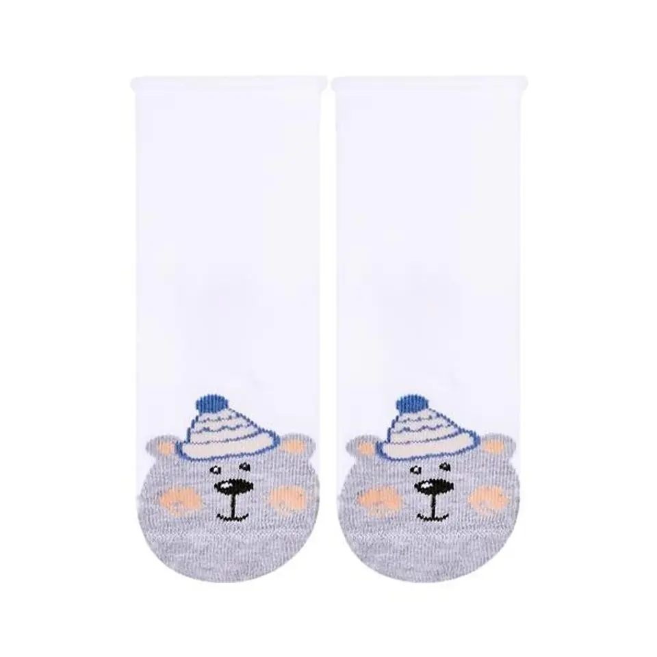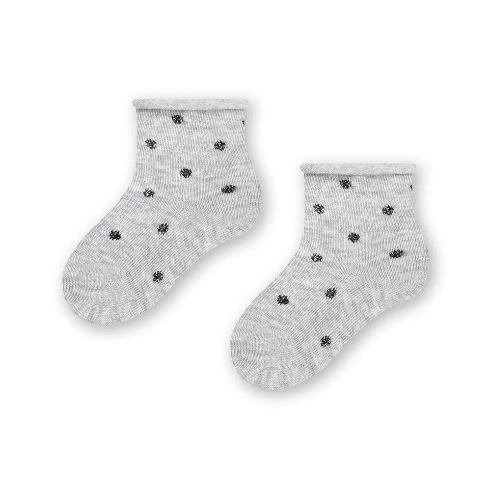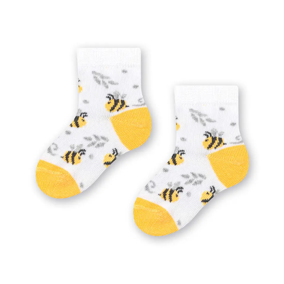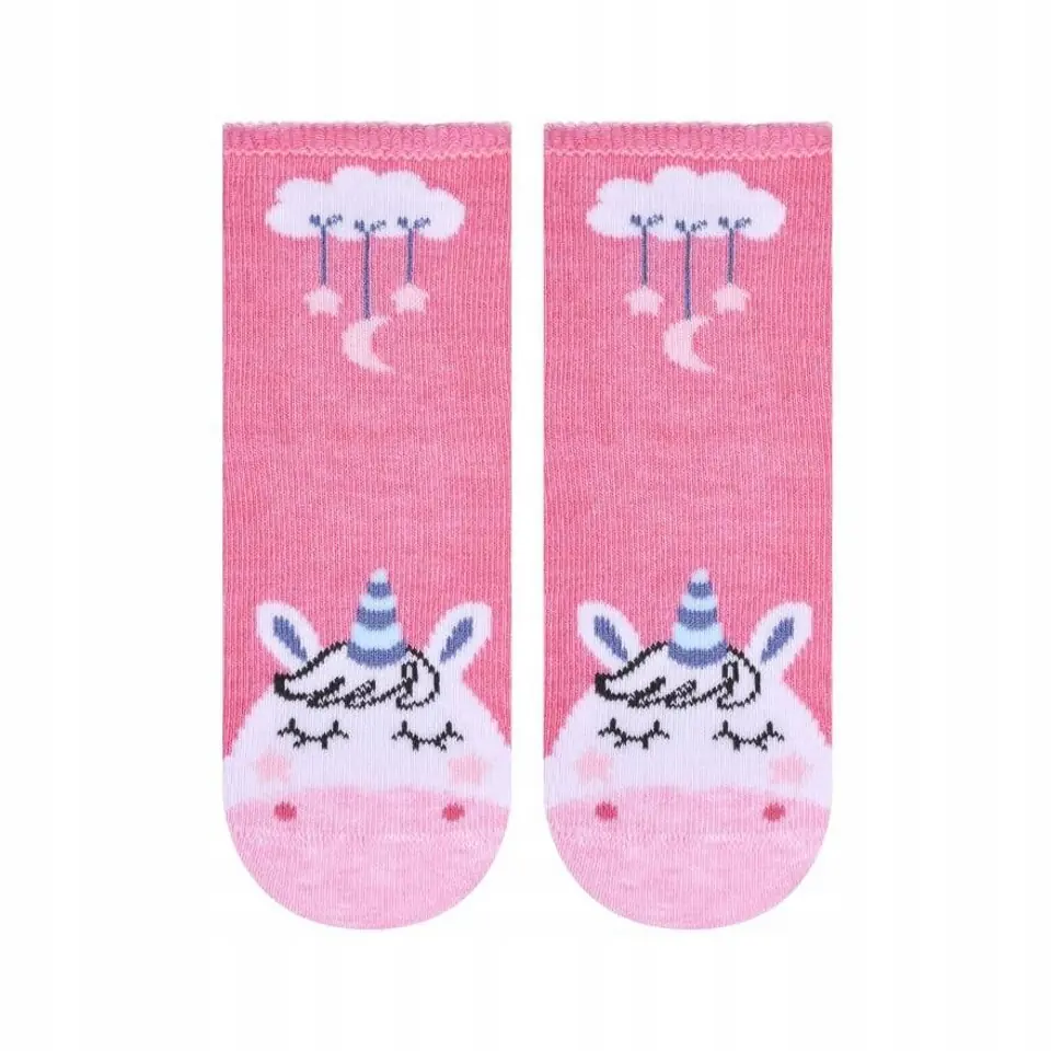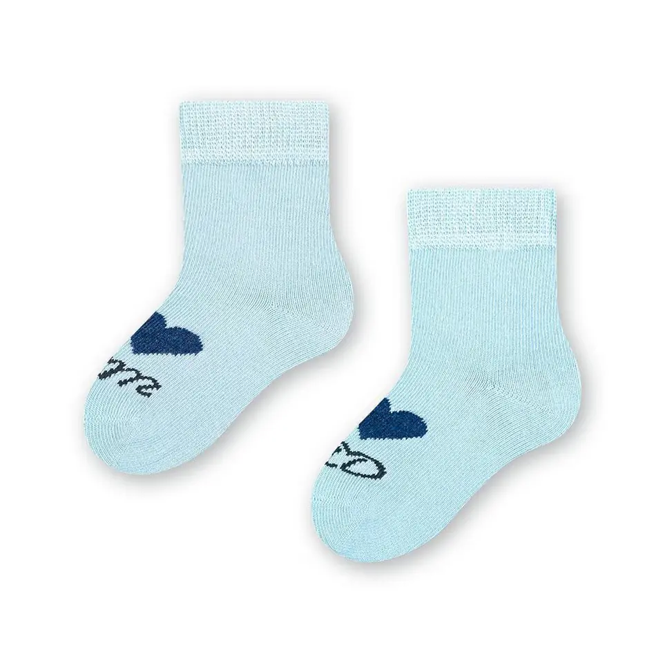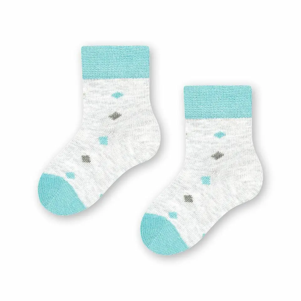 Cotton modeled baby socks. Made of high quality yarn, soft and delicate. Fancy welt finished with a picot or classic. High comfort of use thanks to the use of seamless joints. The product is offered in various design and color variants.