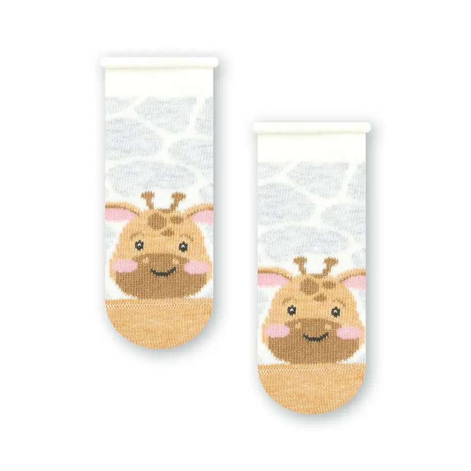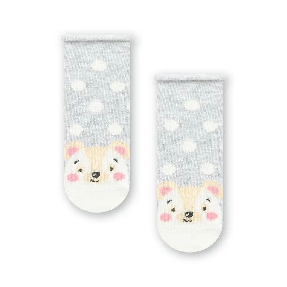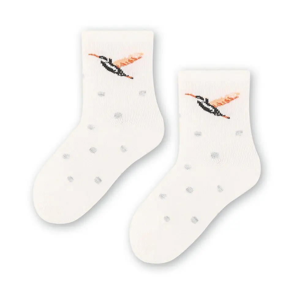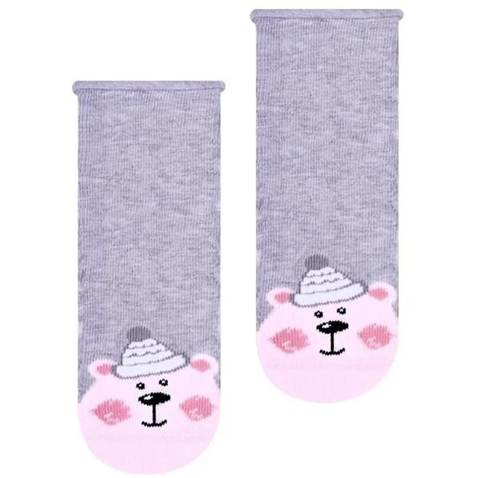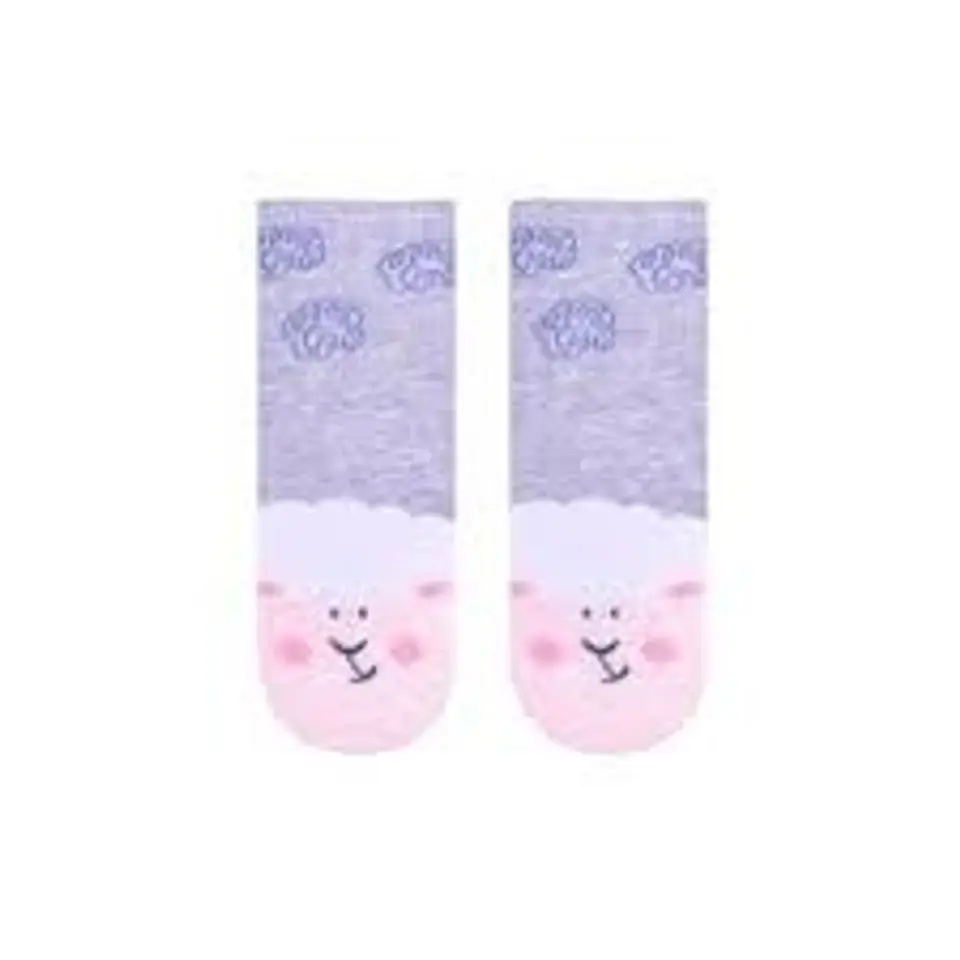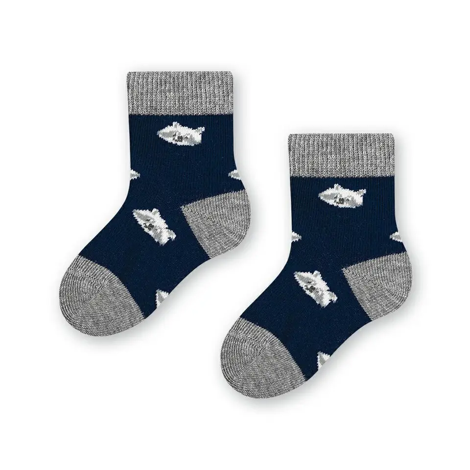 Cotton modeled baby socks. Made of high quality yarn, soft and delicate. Fancy welt finished with a picot or classic. High comfort of use thanks to the use of seamless joints. The product is offered in various design and color variants.