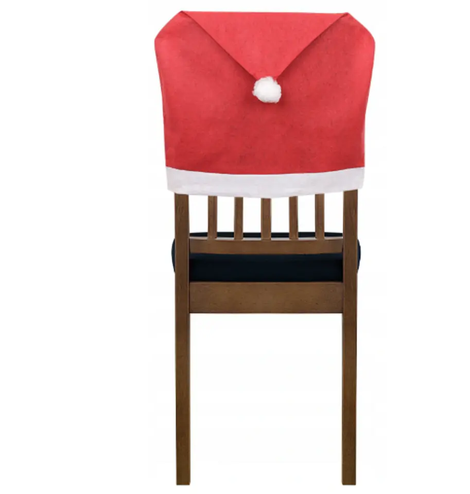 Santa Hat Chair Cover Set of 2pcs 48x60cm A charming set of 2pcs Santa Hat Chair Covers will give a wonderful Christmas vibe to any room. Thanks to them, you can quickly and easily decorate your living room, children's room or office. Ideally suited for Christmas Eve dinner both at home and in the office, as well as in a restaurant. The size fits most chairs on the market. Specification: set of 2 pieces of covers, dimensions: 48x60 cm, red color with white accents, material: polyester.