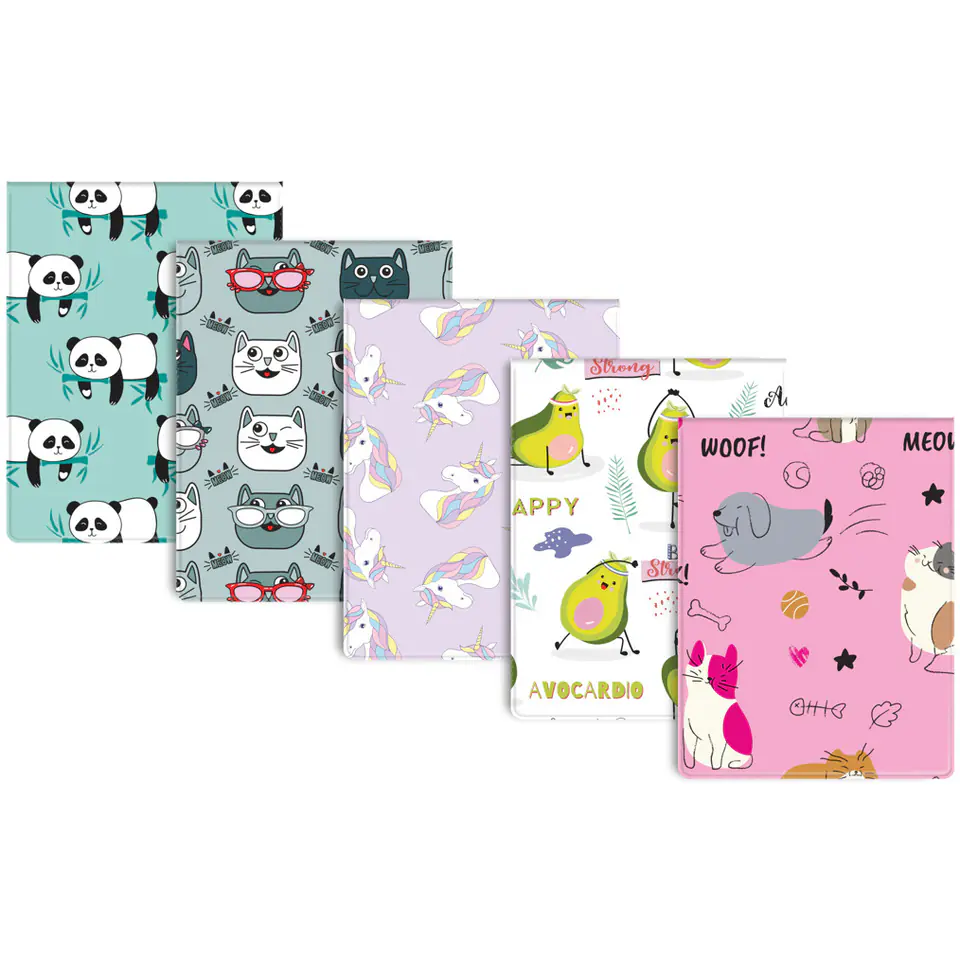 Cover made of PVC foil with full, decorative print, inside stiffened with cardboard; universal format for school documents; equipped with two T-shirts and two pockets; opened vertically; secures a school ID, bicycle card, lunch card or monthly ticket;