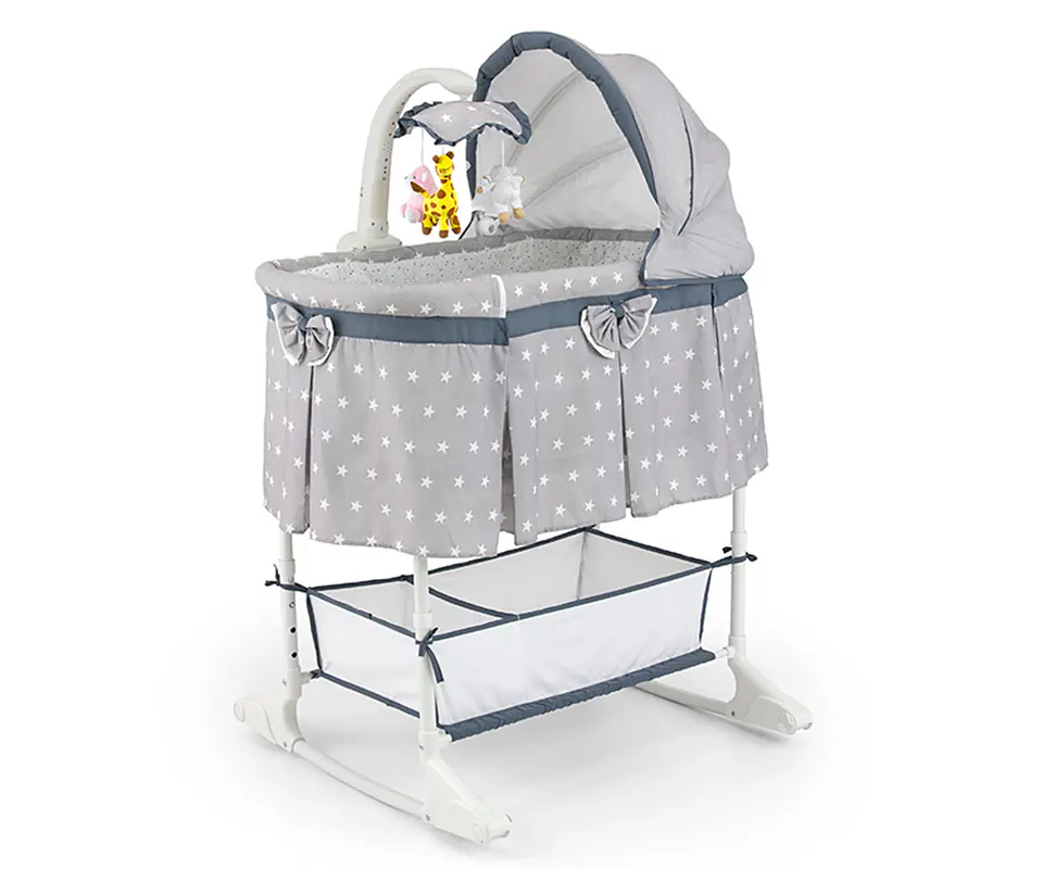 Many parents appreciated that the Sweet Melody cradle has many amenities that are attractive for children and parents. Its great advantage is that it is a multifunctional product, it can be a comfortable cot or a traditional cradle. It has wheels thanks to which we can freely move it to any place in the house or garden, it has a mosquito net that protects the child against insects. The mobility of the cradle gives great comfort because the baby will always be close to the parents. It has a lower basket which will allow us to keep the necessary things always close to the child and respond to his needs in time without moving too far away from him. What is very important, the cradle cover is made of a pleasant and breathable material that can be washed, so that the cradle can be refreshed at any time. It has a carousel with colorful animals and melodies. These functions attract the toddler's attention and the music will help calm the baby down. The cradle has a retractable side wall which, in combination with a lamp built into the carousel, will provide great comfort with daily and often night-time childcare. For the convenience of the parent, these functions are controlled by a remote control. Its another advantage is the adjustable height at various levels, which makes it easier for parents to put the child to sleep and ensure the child's safety.