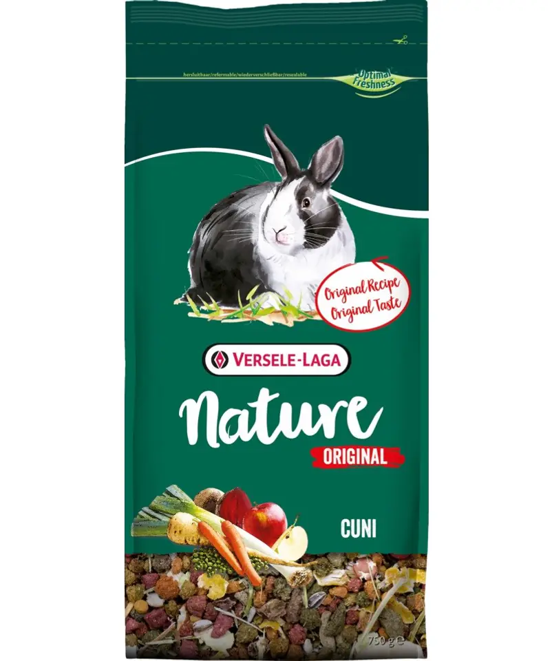 Nature Original Cuni is a full-fledged feed specially adapted to meet the total nutritional requirements of adult rabbits (miniature). This high-quality blend of tasty ingredients contains all the essential nutrients, vitamins and minerals your pet needs to lead a carefree life and enjoy full energy. Fiber, herbs, vegetables and fruits contained in the mixture contribute to excellent digestion, maintaining good dental condition, shiny coat and excellent health. A large variety of ingredients guarantees good taste and excellent absorption. This makes Nature Original the perfect choice for your rabbit's daily serving!