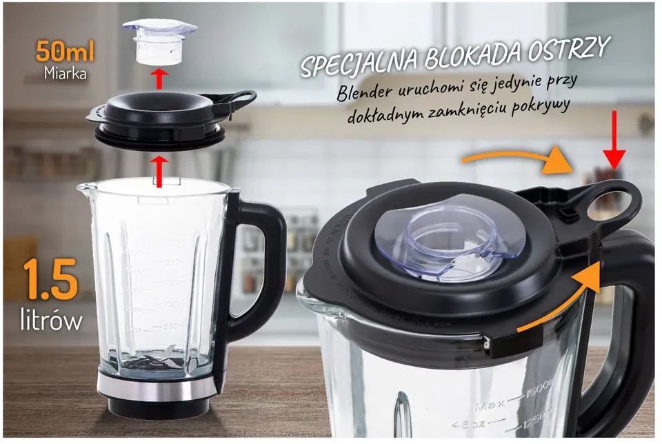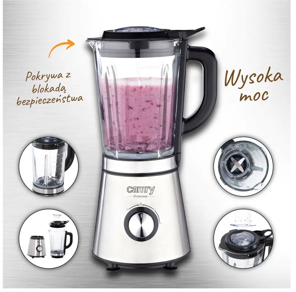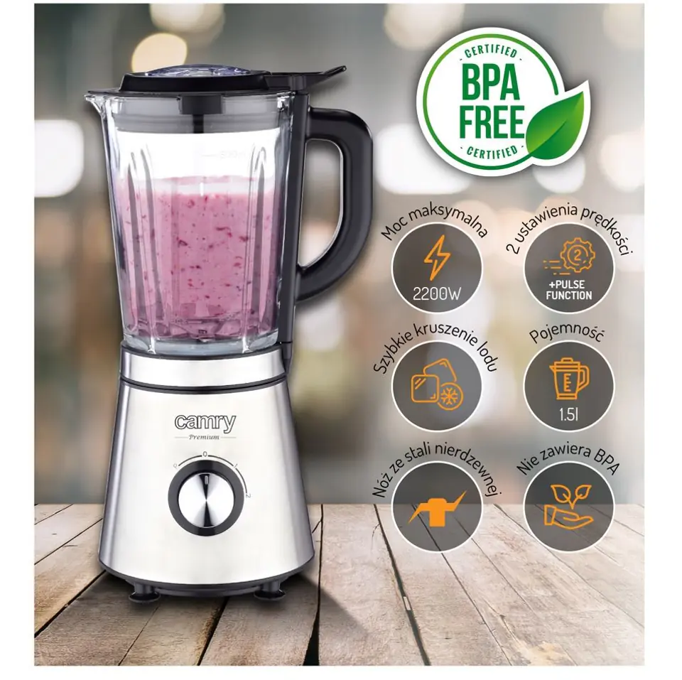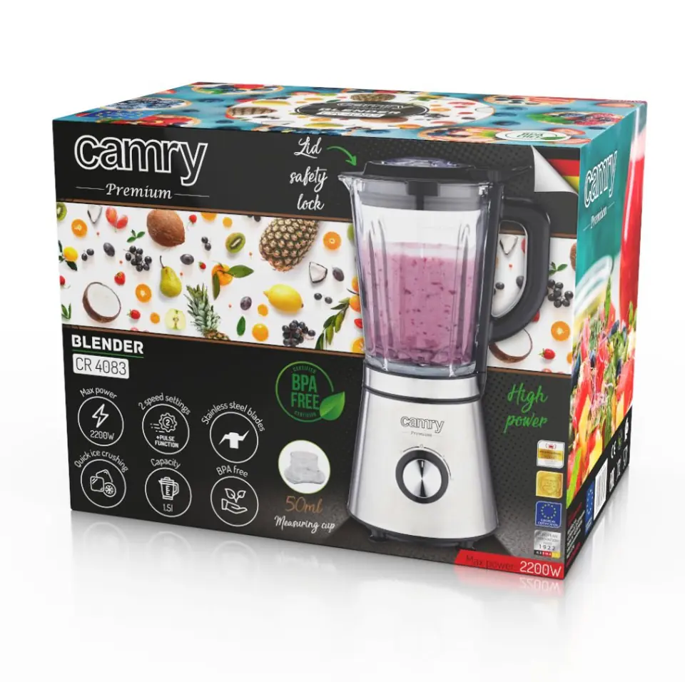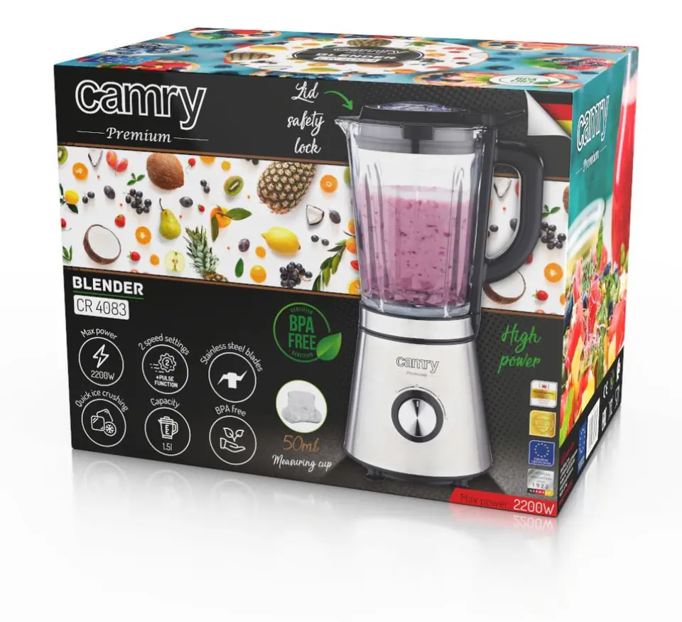 Blender kielichowy CR 4083 o mocy 2200W to wydajne urządzenie do szybkiego rozdrabniania i mieszania produktów spożywczych. Posiada 2 poziomy prędkości, umożliwiające blendowanie z różną intensywnością. Blender został wyposażony w 4-ramienne ostrze z bardzo wytrzymałej stali szlachetnej, które doskonale rozdrabnia i miesza zarówno miękkie, jak i twarde produkty. Dzbanek o pojemności 1,5l wykonano z solidnego grubego szkła. Dzięki temu masz pewność, że blender posłuży przez długie lata. Możesz korzystać z 2 poziomów prędkości oraz funkcji Pulse. Czasowo zwiększa szybkość obrotów ostrza przez co ułatwia blendowanie twardszych warzyw. Dodatkowe bezpieczeństwo zapewnia specjalna blokada ostrzy.Blender nie uruchomi się gdy pokrywa blendera jest niedokładnie nałożona.W upalne dni dobrze jest mieć kostki lodu, ale jeszcze lepiej zrobić z nich kruszony lód, który nie tylko ochładza napój, ale też staje się jego częścią. Blender Camry, dzięki swojej potężnej mocy oraz wytrzymałości i kształtowi ostrza, pozwala Ci szybko i bezproblemowo kruszyć lód, który wykorzystasz zarówno do owocowych smoothies, jak i drinków.