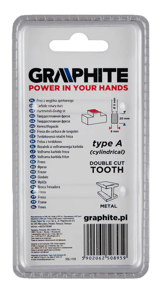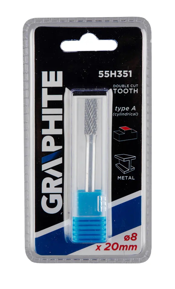 GraphITE metal cutter (ref. 55H351) type A (cylindrical) and size 8 x 20 mm is a tool designed for a straight grinder for cutting or sawing the workpiece. Designed for work in materials such as metal, aluminum and plastics. The use of cemented carbide makes the tool has high hardness and resistance to abrasive wear. This cutter is characterized by double cuts that allow for easy removal of allowances in the processed materials.