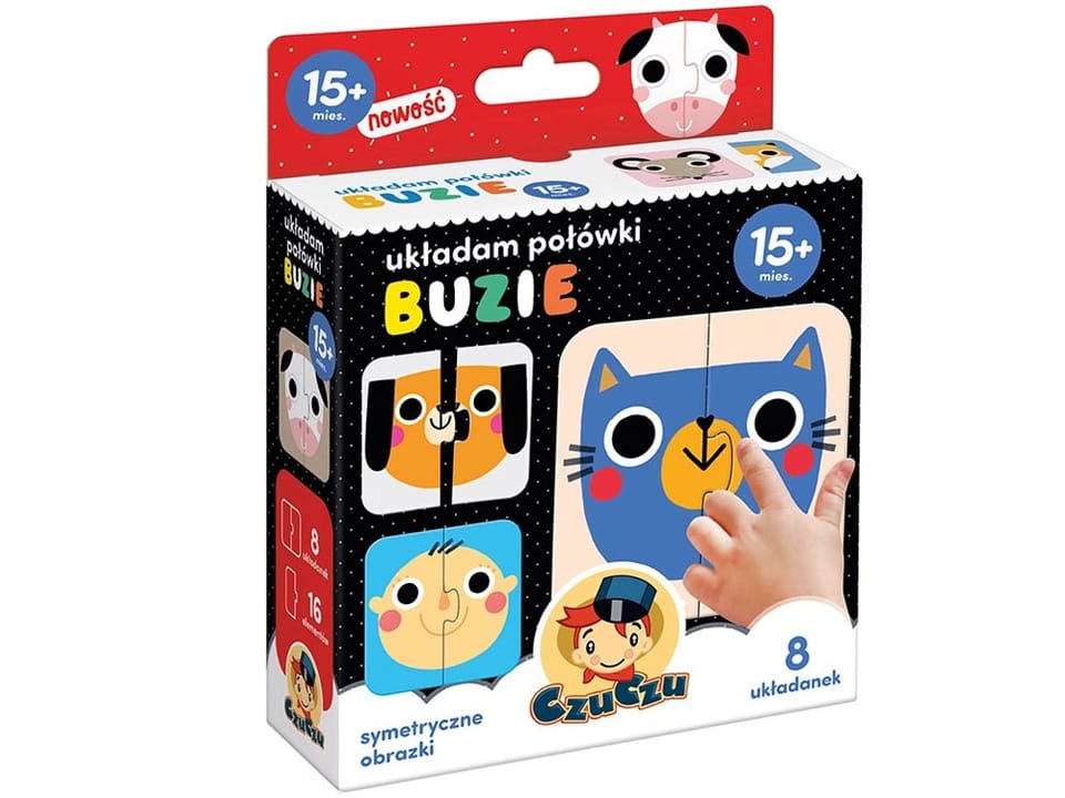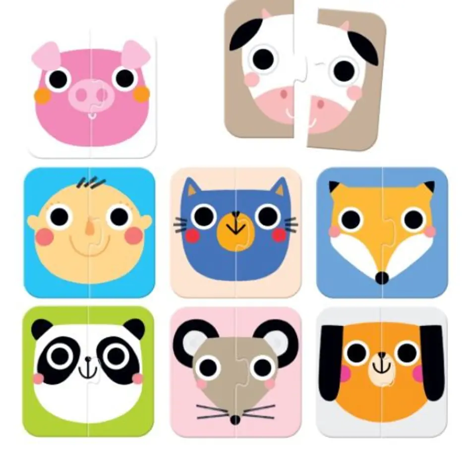 Whose face is this? Match two halves and see! This educational set is perfect as a first puzzle for toddlers. It includes 8 large two-piece puzzles. Creative and unexpected combinations are also possible, adding extra fun!