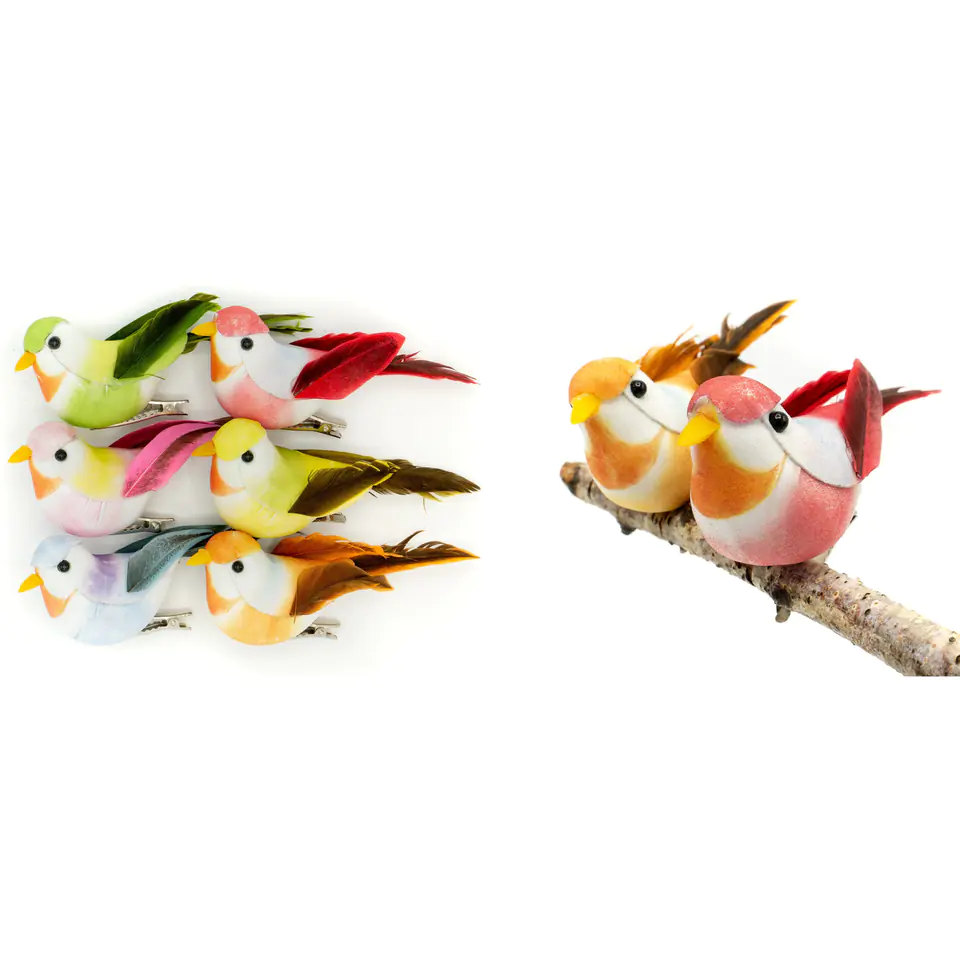 Decorative birds in size 10 cm with a clip for easy attachment of the bird. Display includes 6 pcs. (6 colors).