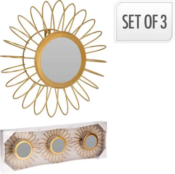 Set of 3 decorative mirrors in gold color 26 cm Set of 3 pieces of metal mirrors in a gold frame designed for wall mounting. Unique design and color will attract everyone's attention. Hang them in the living room, hallway, room or office and enjoy the unique decoration. Specification: Material: metal, glass, size: 26cm x 6.5cm, frame color: gold.
