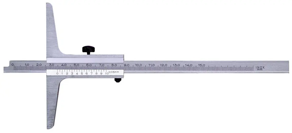 Stainless steel. Chrome graduation on matt. The ends of the scale and crossbars are hardened. Pitch in mm with vernier 1/20 mm. With retaining clamp. Tolerance according to DIN 862.