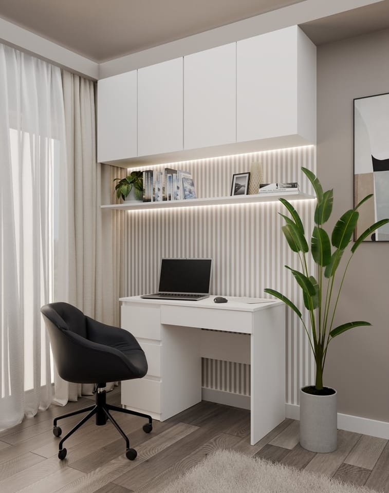 | Additional information: | Edges - finished with ABS plastic (characterized by high mechanical and chemical resistance), Laminated chipboard is resistant to mechanical stress and extreme temperatures, Desk with drawers on the left (also available with drawers on the right), Clean the furniture surface with a soft cloth. Avoid using harsh chemicals, The photos of the sets show an example arrangement with other furniture from the collection. The remaining models are available for sale separately., Self-assembly furniture, Smooth sides without plugs and visible holes |