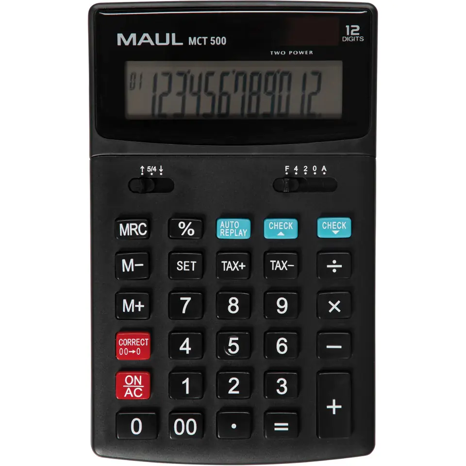 MAUL MCT 500 business calculator in black with large 12-position LCD display. Reliable, accurate and professional-looking. Faster search: function and numeric buttons in different colours. Ergonomic: The display can be placed flat at an angle for easy reading. The large size and clearer display allow for more comfortable work. Plastic buttons: durable and easy to clean. With non-slip rubber points on the back. Energy-saving, thanks to dual battery and solar power, with auto power off function. Check & correct function - the ability to check and correct calculations. Equipped with 3 memory buttons, calculation of percentages, taxes, double zero button. In addition, the possibility of automatic rounding up or down and displaying digits after the decimal point. Warranty: 5 years. Dimensions: 17.4 x 10.7 x 2.2 cm. Includes one battery (LR1130). Eco-friendly cardboard packaging, without the use of plastic, with a Euro tag.