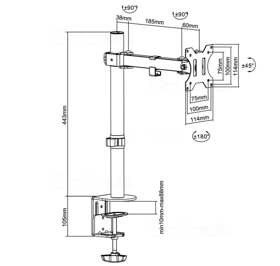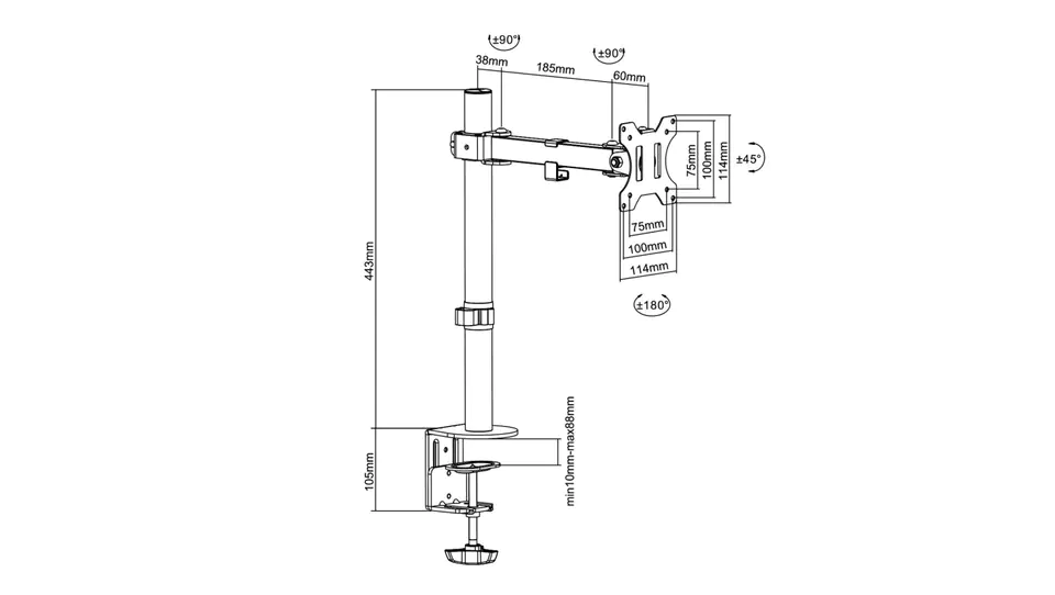 The universal desk mount on the boom is used for mounting LCD TVs, LED TVs and monitors of various brands weighing up to 8kg and with screen dimensions from 13" to 32"
