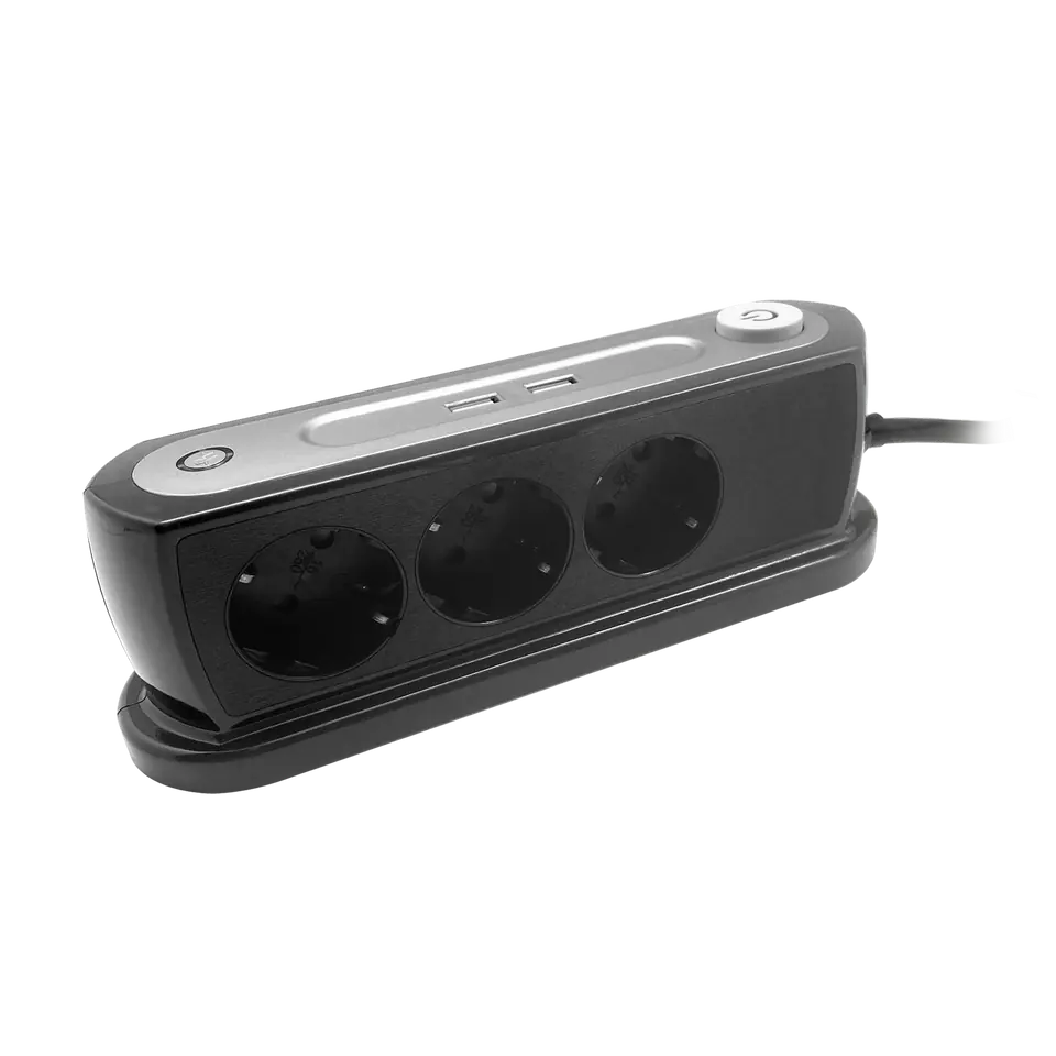 The desktop power strip is an excellent and practical device that allows you to connect various types of equipment, including those charged via the USB port. It has 3 current sockets with surge protection (type 3) and 2 USB ports, which are integrated into the device housing so that it takes up little space on the desk top. The strip is additionally equipped with a main switch and a 1.4 m long power cable.