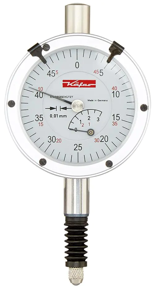 Design: with shock protection , measuring pin and fixing pin (diameter 8 mm h6) made of resistant stainless steel, lap-in measuring mandrel The precisely routed sleeve above the measuring stem is arranged and cushioned in such a way as to prevent shocks from being transmitted to the measuring mechanism. Measuring pin protected by rubber bellows, scale and back wall with O-ring sealing for protection against liquids and contaminants. Delivery in a case.
