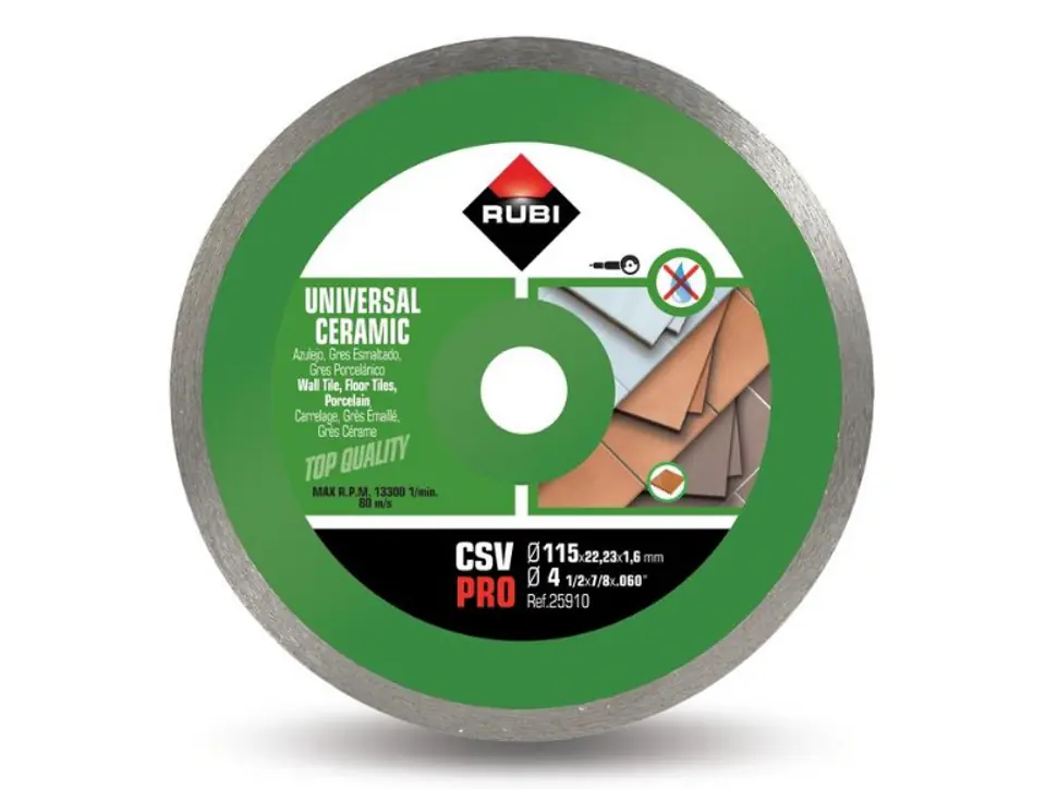 The shape of the RUBI CSV diamond blade makes it ideal for cutting all kinds of ceramics and other wall stone tiles with a thickness of less than 25 mm.