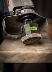 After turning on the grinder, apply the drill diagonally to the plate. When the drill sinks slightly, a small circular movement should be made with the tool. This movement is important so that the dust generated during work is moved away, lowering the temperature locally. When properly used, up to 35 holes can be made with a smaller drill, i.e. with a diameter of up to 25 mm, and up to 100 holes with a larger drill.