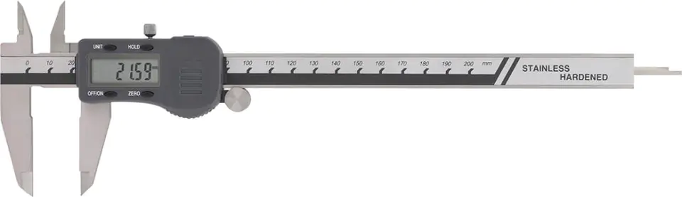 Made of: stainless steel, hardened, finely ground measuring surfaces, with fixing screw, digit height on LCD display 12 mm, with RS232 data output. Supplied with CR357 battery, 1.5V, in a plastic cassette.