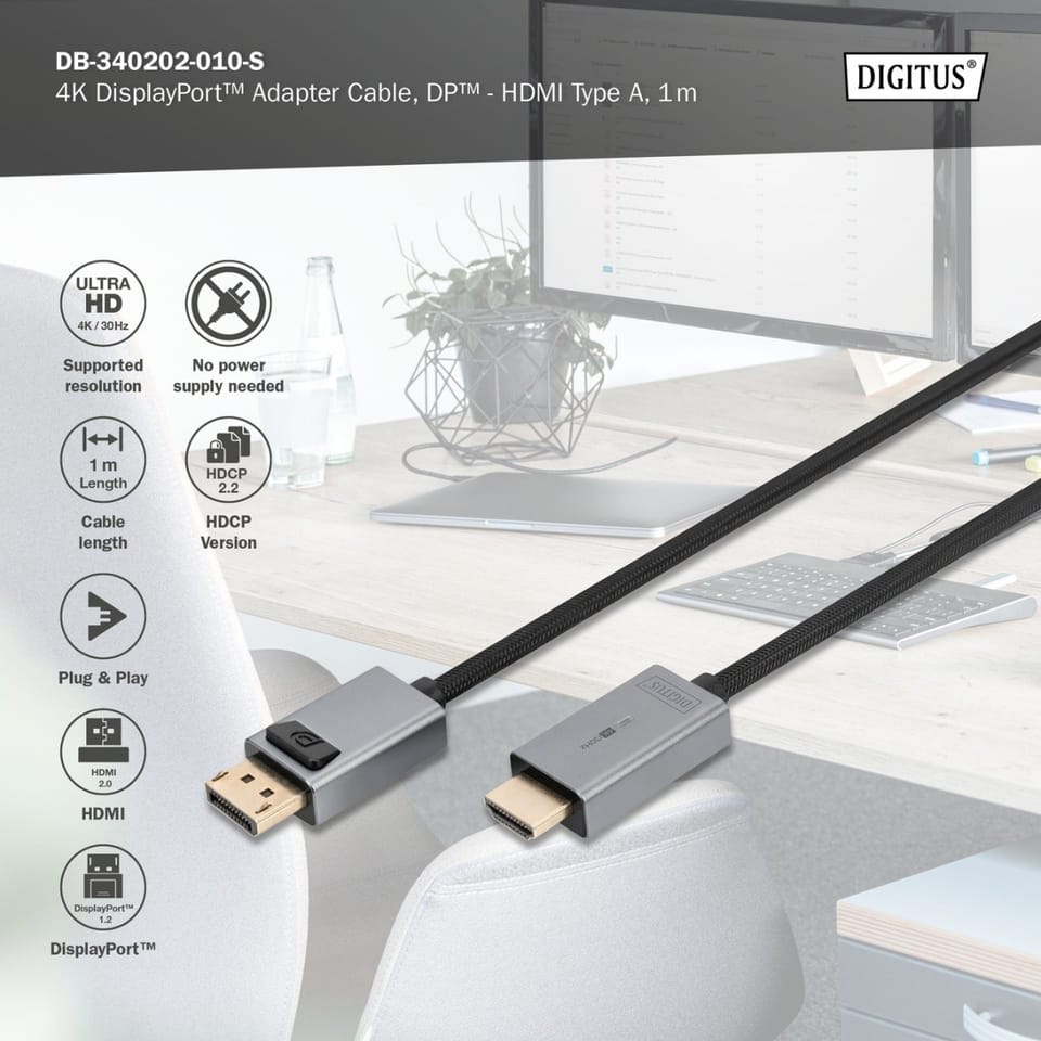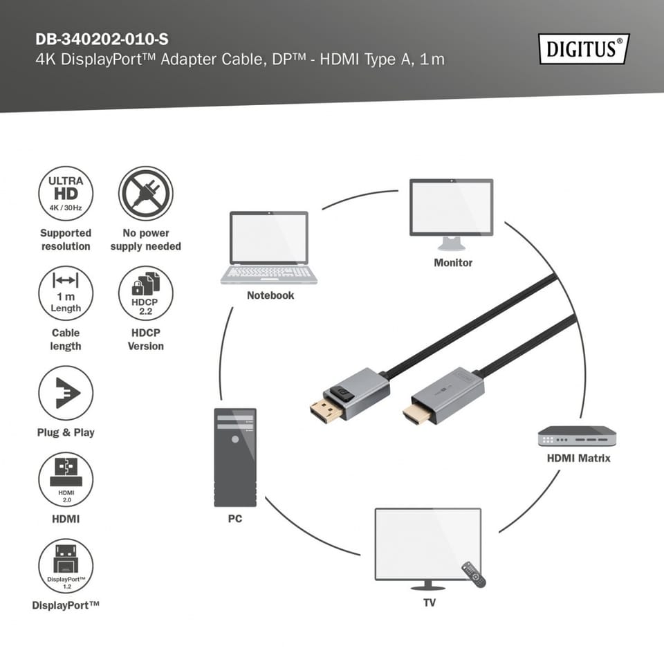 The 4K DisplayPort cable adapter allows a PC or laptop with DP output to be connected directly to a device with an HDMI port, such as a TV or monitor. When used with Mac devices, the cable supports Cloned Image mode or Extended Desktop mode, while when used with Windows devices it supports Duplicate mode or Extend mode. The adapter does not require an external power supply.