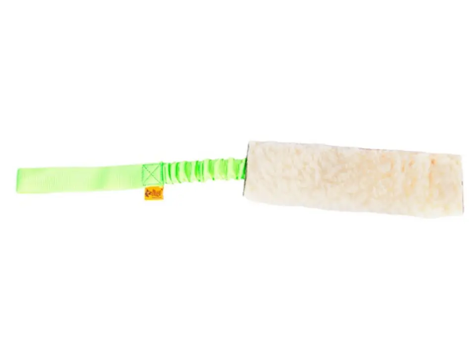 The toy for the dog jerk on the bungee handle is made of sheep's wool.