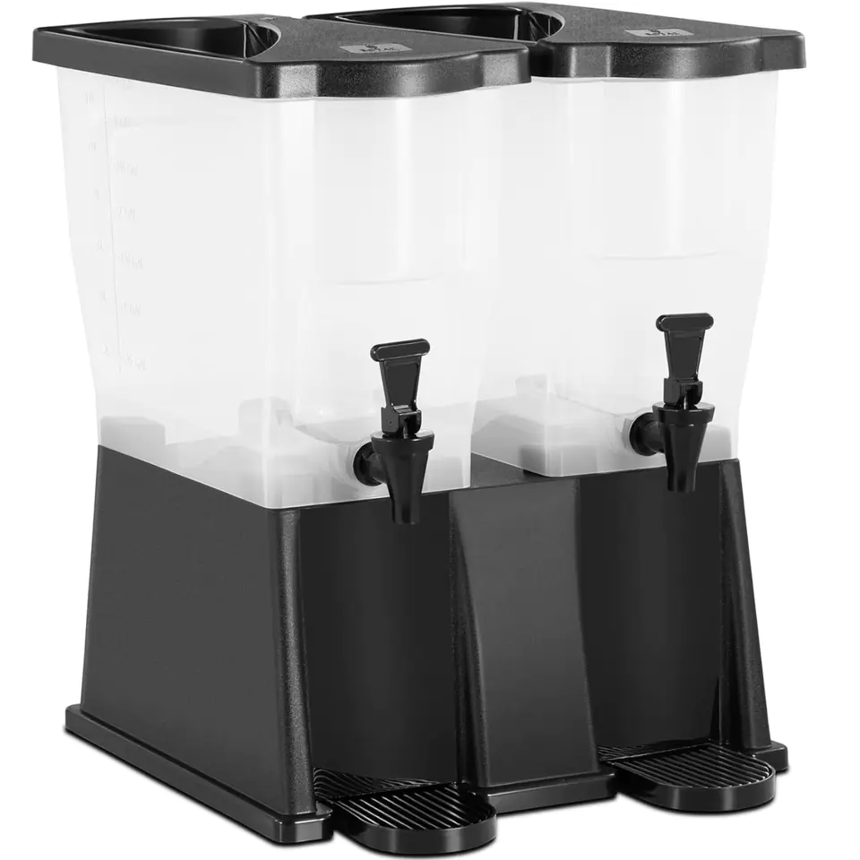 Manufacturer's code: 10012568The Royal Catering double juice dispenser will work well during breakfast in hotels, restaurants, catering and outdoor events. The capacity of the dispenser is 2 x 9.3 l, a total of 18.6 l. Transparent plastic nicely exposes the contents. Smooth-running taps allow you to precisely measure portions of the drink. The maximum height of the dishes placed under the tap is 200 mm. The materials used to make the dispenser are scratch-resistant and easy to clean.